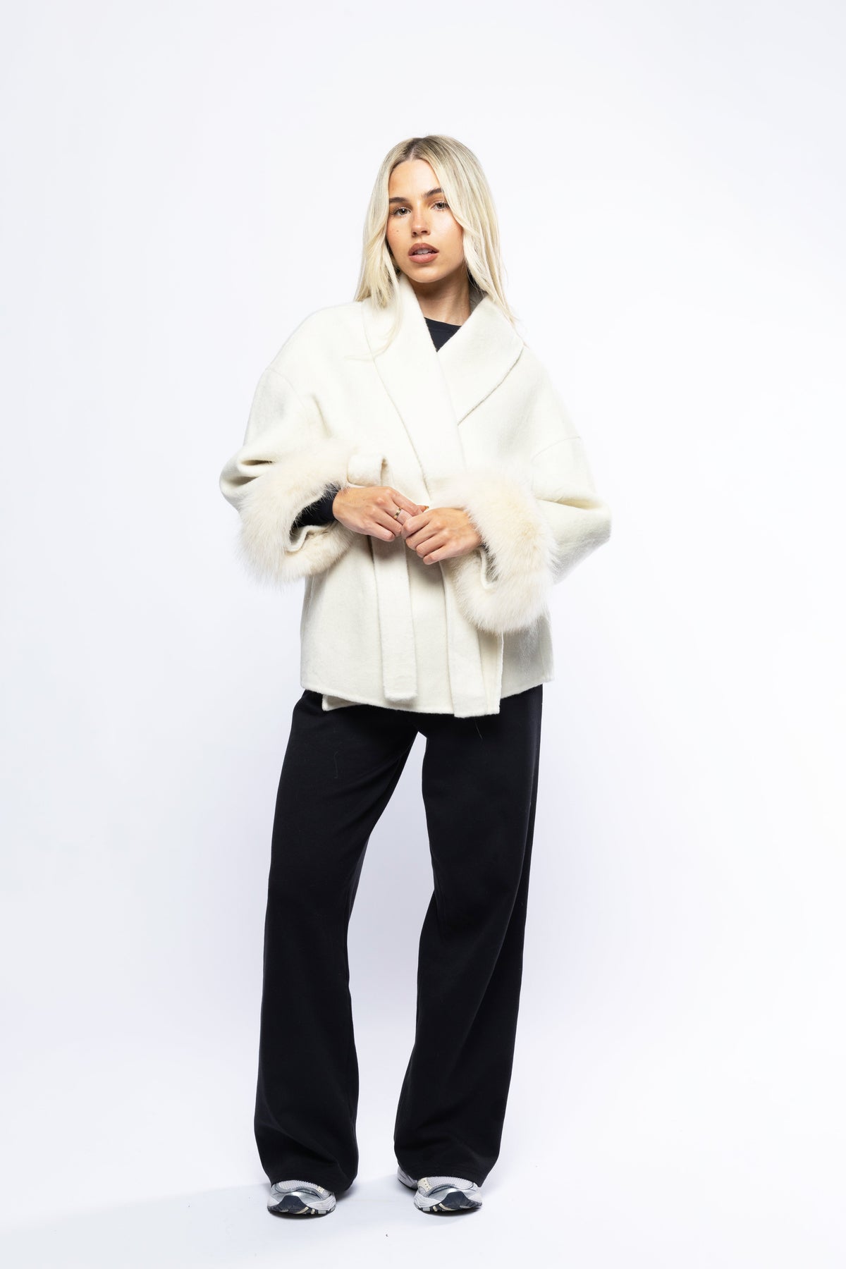 Understated luxury. Effortless allure. The Aurora Wool Coat embodies timeless sophistication with a modern sensibility. Crafted from 100% premium wool, it features a refined wrap silhouette that flatters effortlessly while offering warmth and structure. The detachable fox fur cuffs add a touch of opulent texture, allowing you to transition seamlessly from elegant daywear to evening refinement.